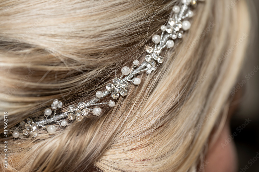 Fototapeta détail d'une coiffure de mariée avec des strass et des perles sur cheveux blonds