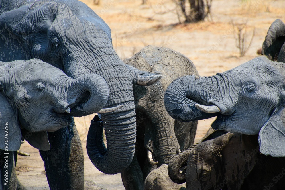 Fototapeta herd of elephants drinking from watering hole at watering hole near tree