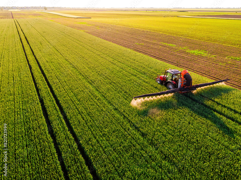 Fototapeta Drone shot of a tractor spraying in lush green wheat fields under the bright sun