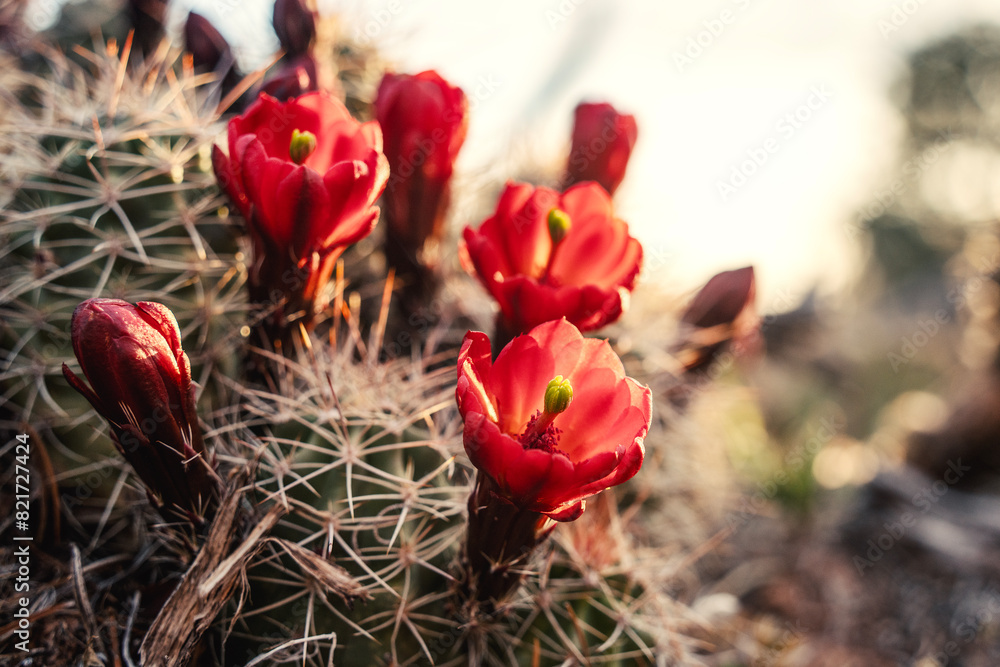 Fototapeta Close Up Of Red Flowering Cactus At Sunrise