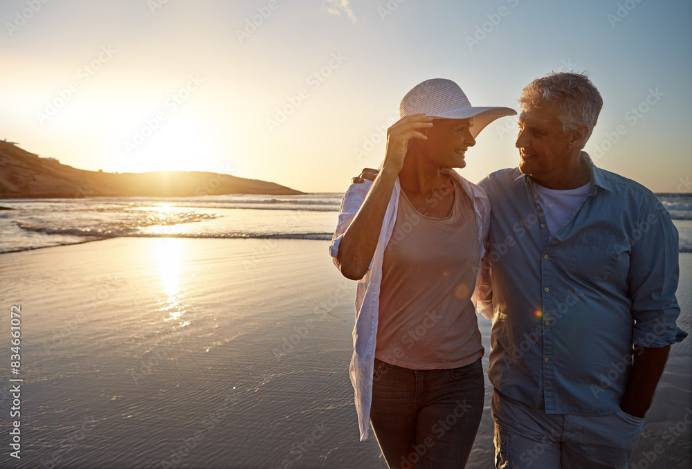 Fototapeta Mature, happy couple and walking with hug on beach in sunset for love, embrace or bonding in nature