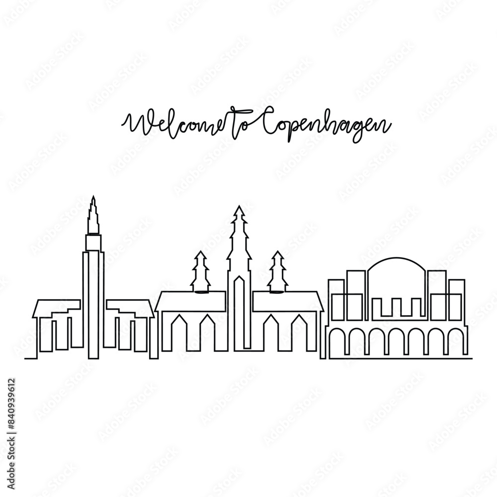 Fototapeta One continuous line drawing of Copenhagen skyline vector illustration