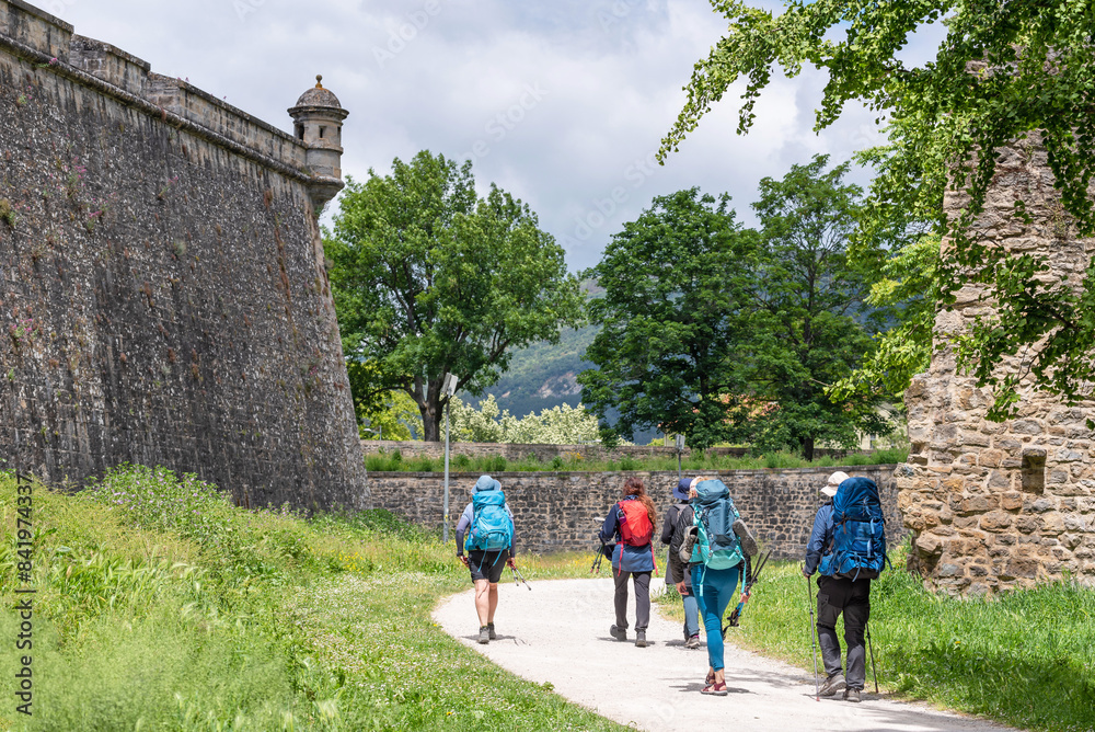 Fototapeta Way of St. James. Group of pilgrims on the Walls of Pamplona