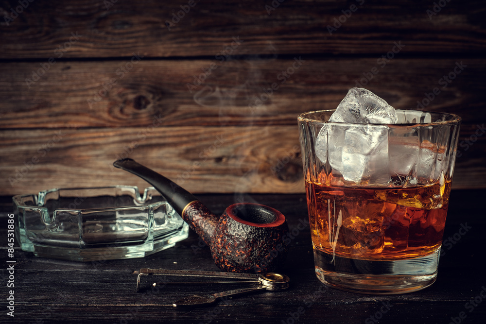 Fototapeta Glass of whiskey with ice and pipe on a wooden background.