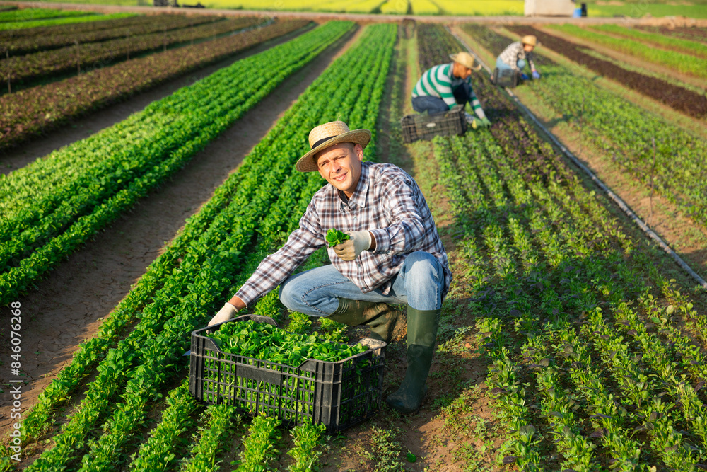 Fototapeta Portrait of young adult male farm worker harvesting corn salad on farm field