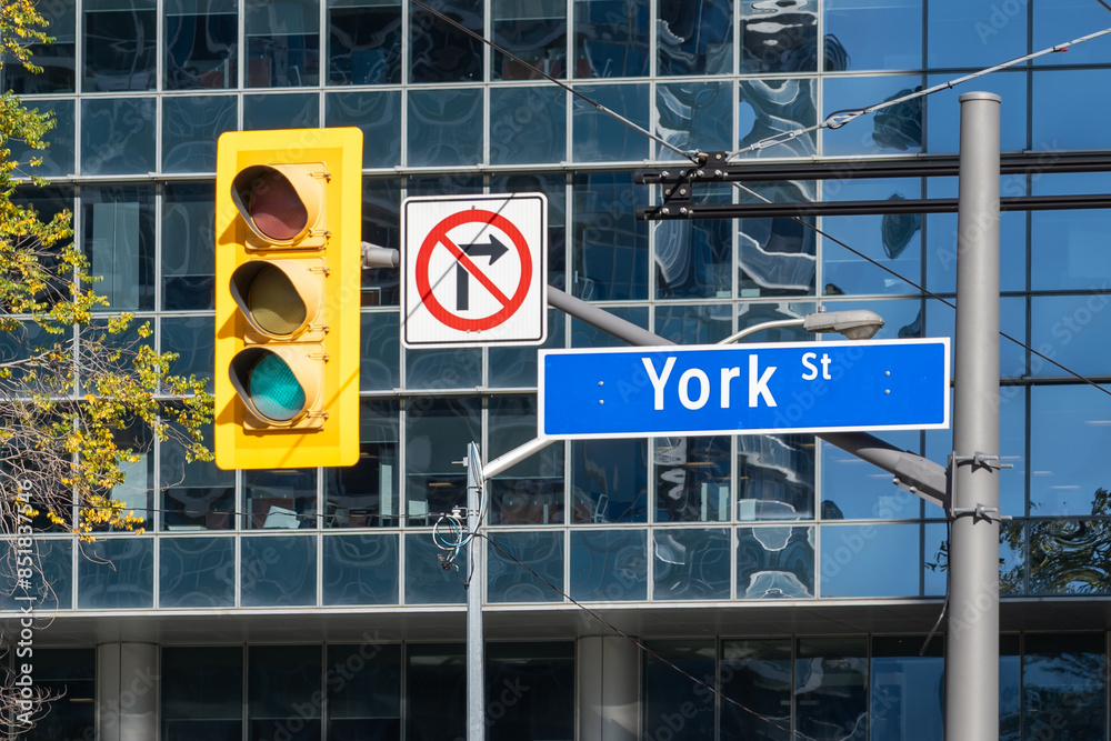 Fototapeta Toronto, Canada - October 22, 2023: Closeup of York street sign and traffic light in downtown Toronto Canada