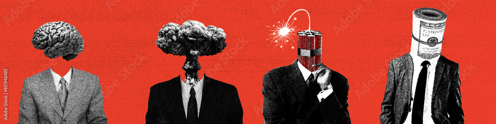 Fototapeta Surreal collage of businessmen with a brain, nuclear explosion, dynamite, and money roll as heads