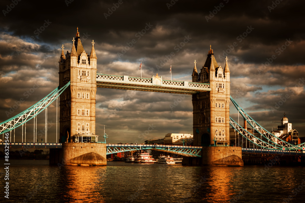 Tower Bridge in London, the UK. Dramatic stormy and rainy clouds