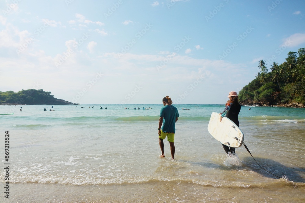 Fototapeta A Sri Lankan surfing coach and his student are going on the beach to the ocean t