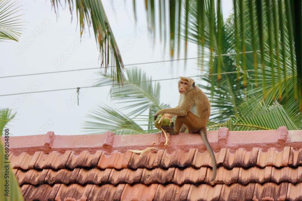 Fototapeta A wild monkey eats a coconut on the house rooftop in the jungle village
