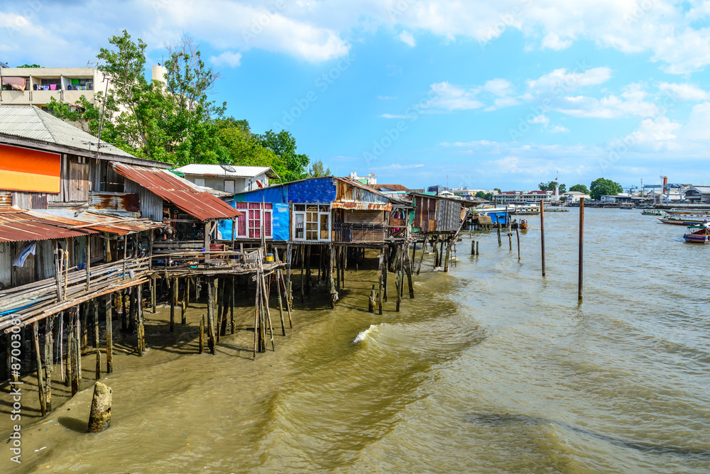Fototapeta Thai traditional house, vilage riverfront in Bangkok thailand.