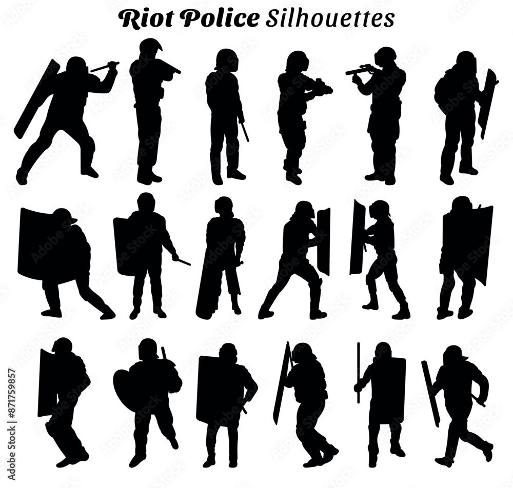Fototapeta Collection of vector illustrations of riot police silhouettes