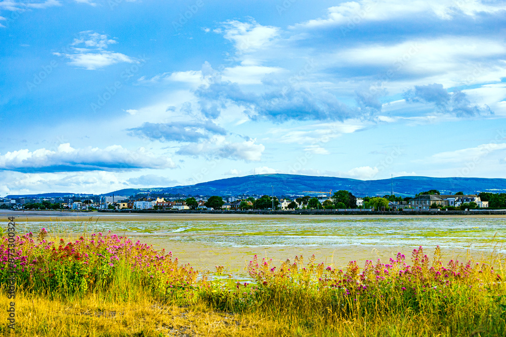 Fototapeta Dublin, Ireland - wetland beach under blue sky and white clouds