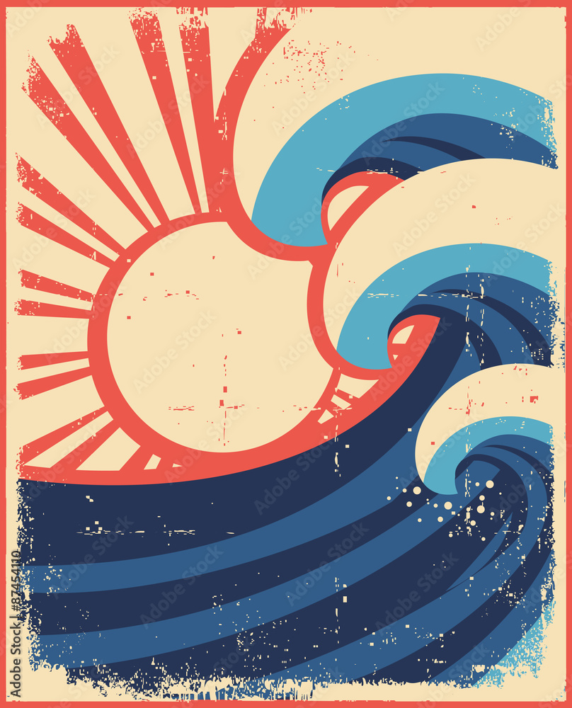 Fototapeta Sea waves poster.Grunge illustration of sea landscape.