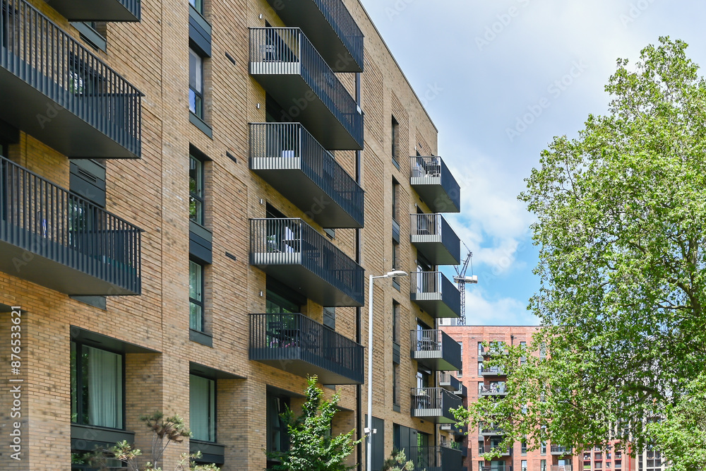 Fototapeta Modern accommodation in Barking along River Roding: London, UK, 24 May 2024