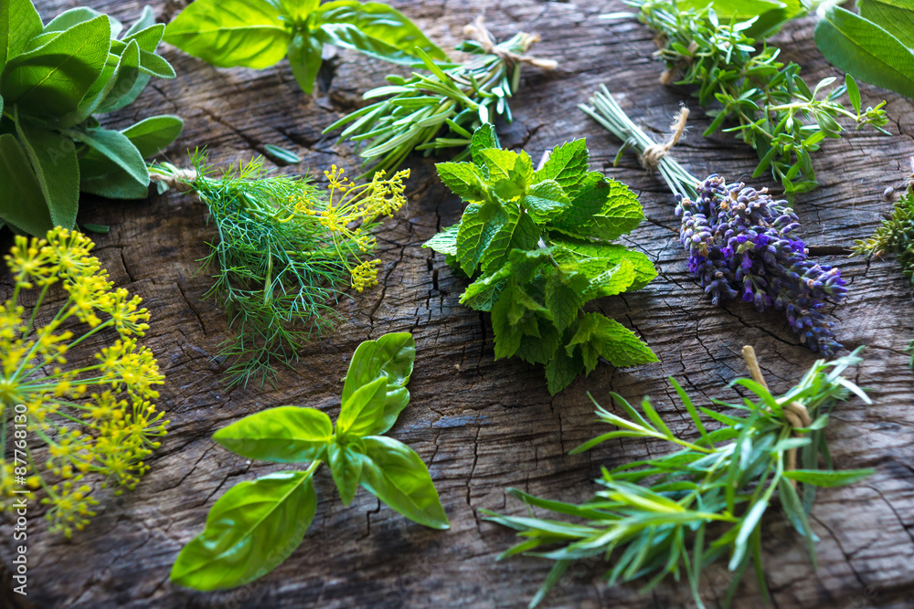 Fototapeta Fresh herbs on wooden background