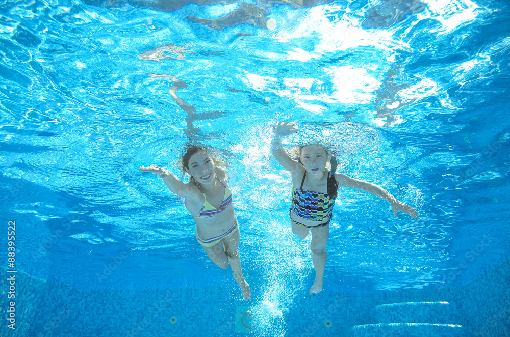 Children swim in pool underwater, happy active girls have fun in water