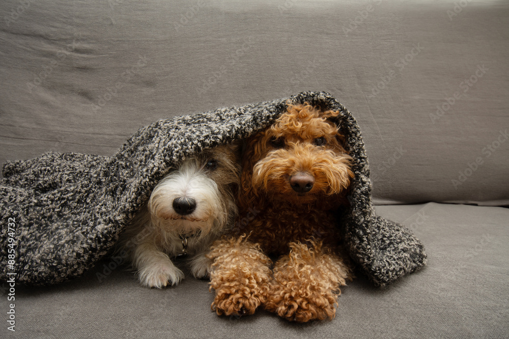 Fototapeta Two hide, cold or afraid dogs covered with a blanket