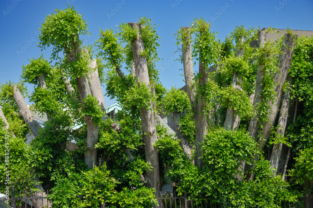 Fototapeta Tall trimmed trees with fresh green leaves sprouting from tree trunks, shot against clear blue sky