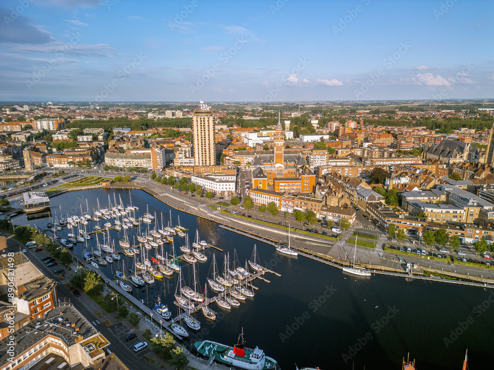 Fototapeta The drone aerial view of Marina Port du Commerce and the tower of the townhall, Dunkirk, France