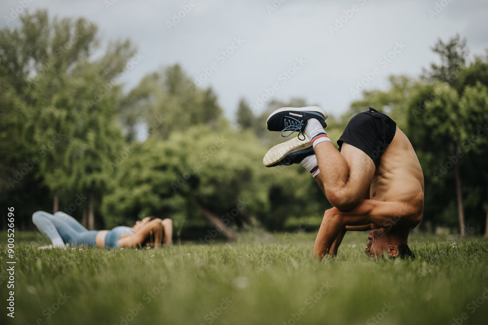 Fototapeta A man practices a headstand exercise in an open grassy park with trees and a woman exercising in the background on a sunny day