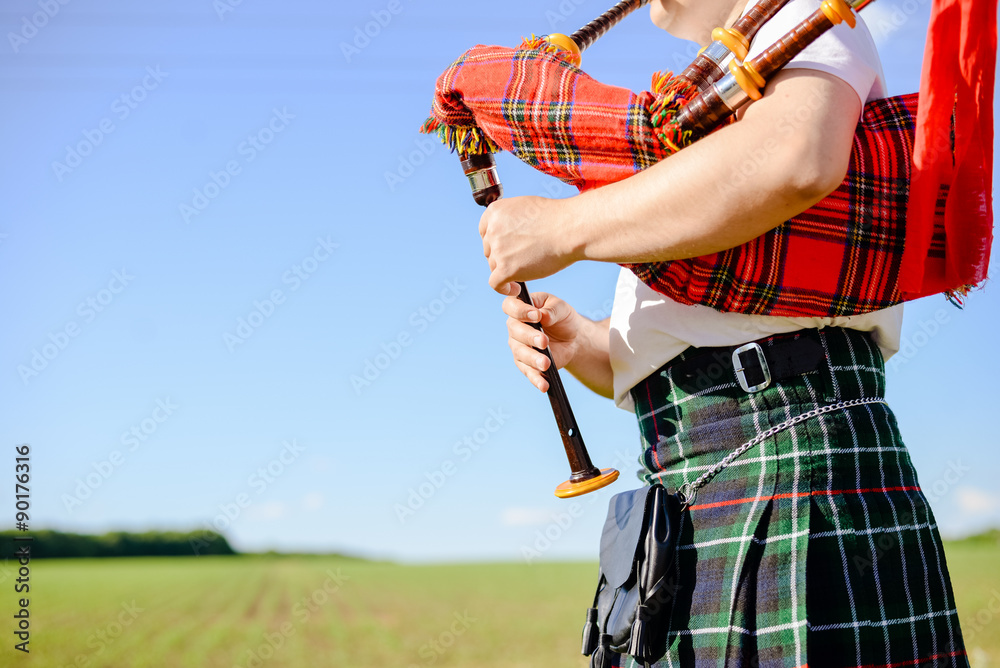 Male playing Scottish traditional pipes on green summer outdoors