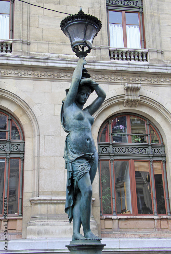 Fototapeta Bronze lamppost shaped as antique caryatide near Palais Garnier, the Paris Opera