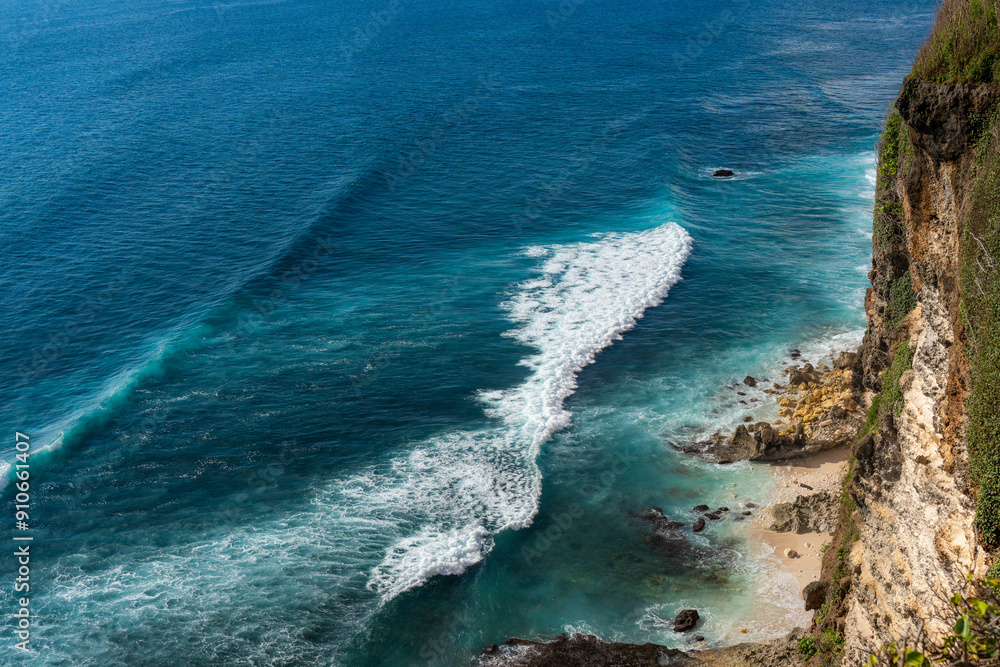 Fotografie Top down of waves crashing in ocean near Uluwatu temple in Bali, Indonesia