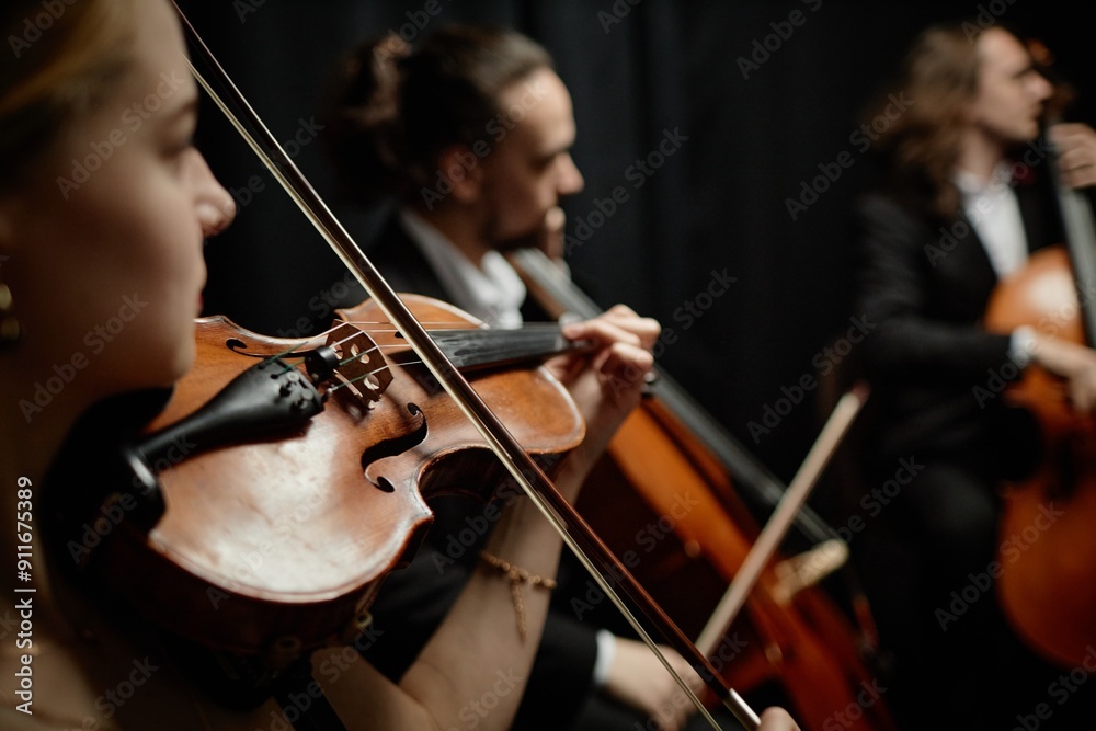 Fototapeta Cropped side view shot of unrecognizable female musician playing violin with cha