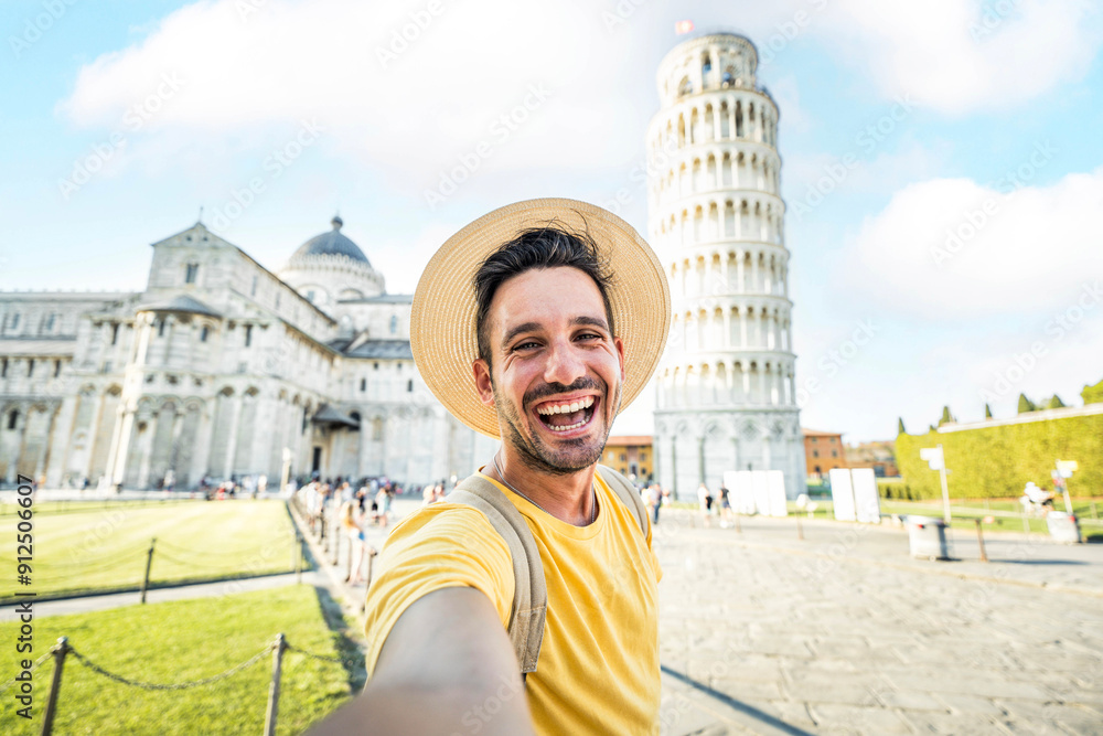 Fototapeta Happy tourist taking selfie picture in front of the famous leaning Tower and Pis