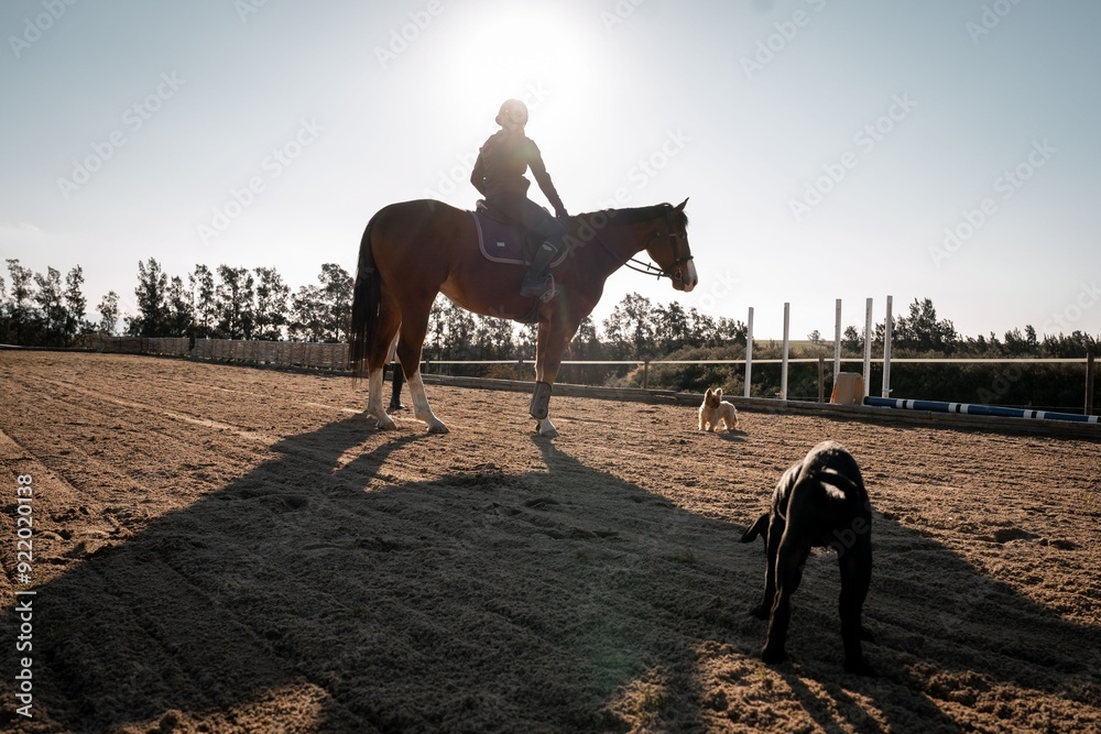 Fototapeta Horse riding in an outdoor arena with dogs playing