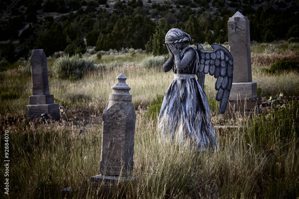 Fototapeta Girl wearing an angel costume in an old grave yard