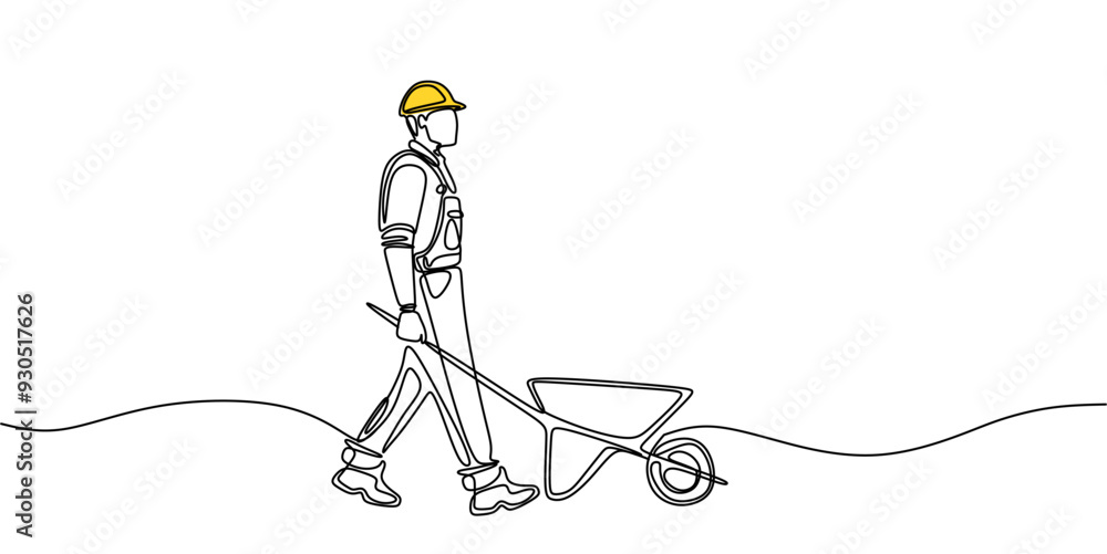 Fototapeta One line drawing of a construction worker with a wheelbarrow