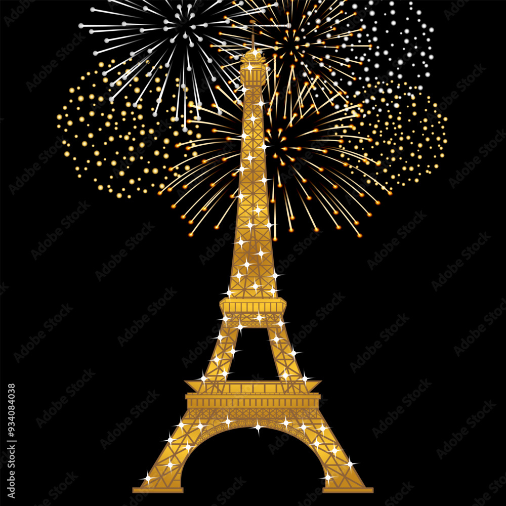 Fototapeta Ambiance de fêtes nocturnes à Paris en France, avec la tour Eiffel scintillant de mille lumières devant un feu d’artifices dans les tons or sur un fond noir