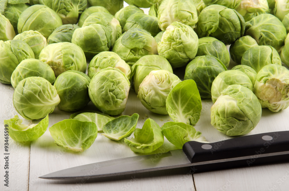 Fototapeta trimmed brussels sprouts and a kitchen knife