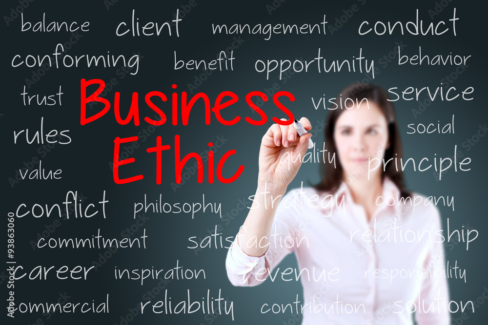 Fototapeta Business woman writing business ethic concept. Blue background.