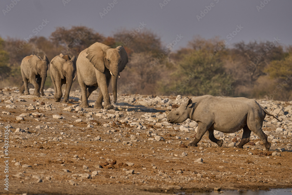 Fototapeta Black Rhinoceros (Diceros bicornis) makes way to a herd of African elephant (Lox