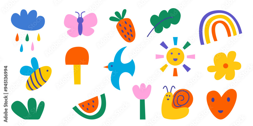 Fototapeta Set of cute naive cutout elements and doodle organic shapes