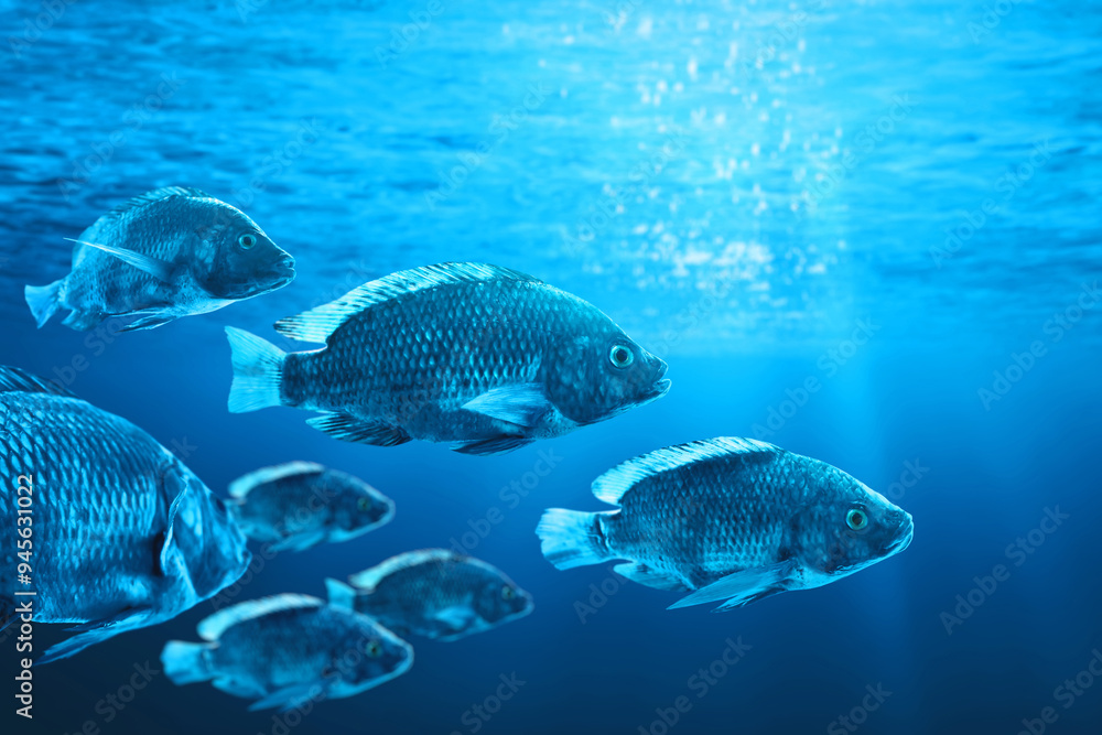 Fototapeta Group of nile tilapia fish swimming in the ocean.