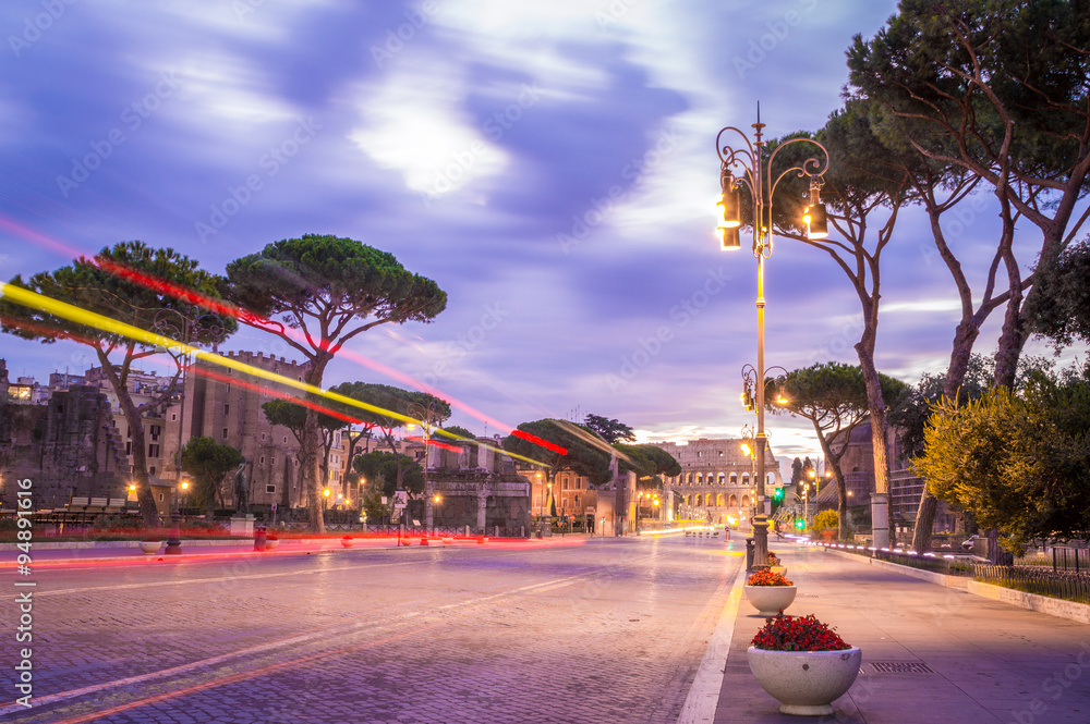 Fototapeta Abstract dark artistic edit of Roman forum at dawn with the Colosseum in the bac