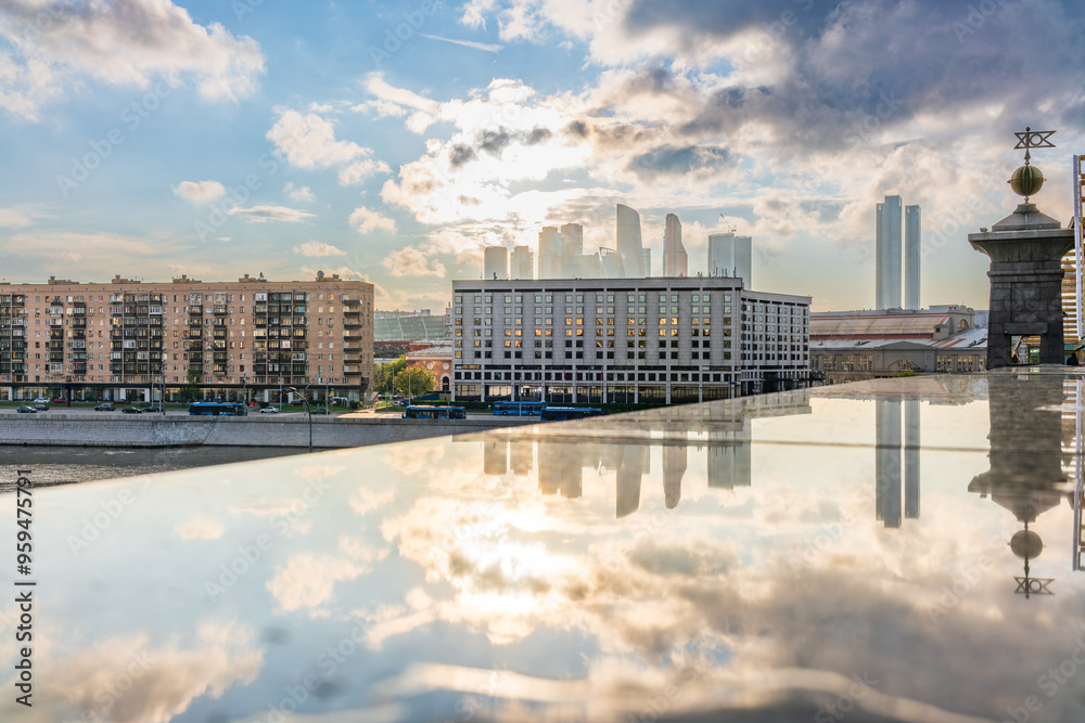 Fototapeta View of Berezhkovskaya Embankment in Moscow with reflection on a mirror stone su