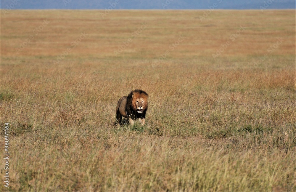 Fototapeta Adult male lion with full mane walking in the grasslands of the Serengeti Nation
