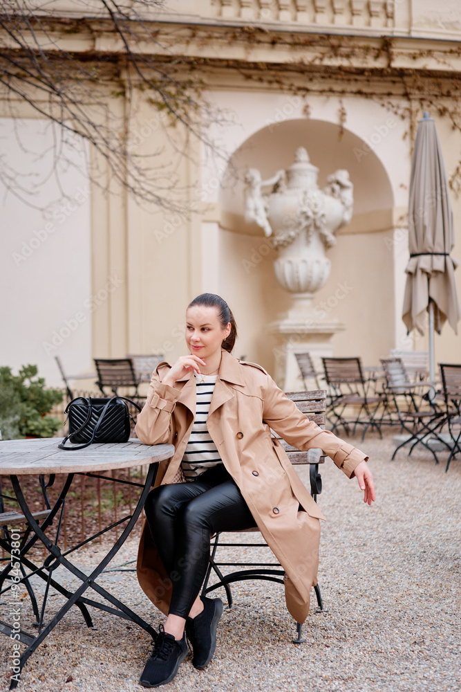 Fototapeta Young prety woman wearing coat is sitting in outdoor cafe in Wien