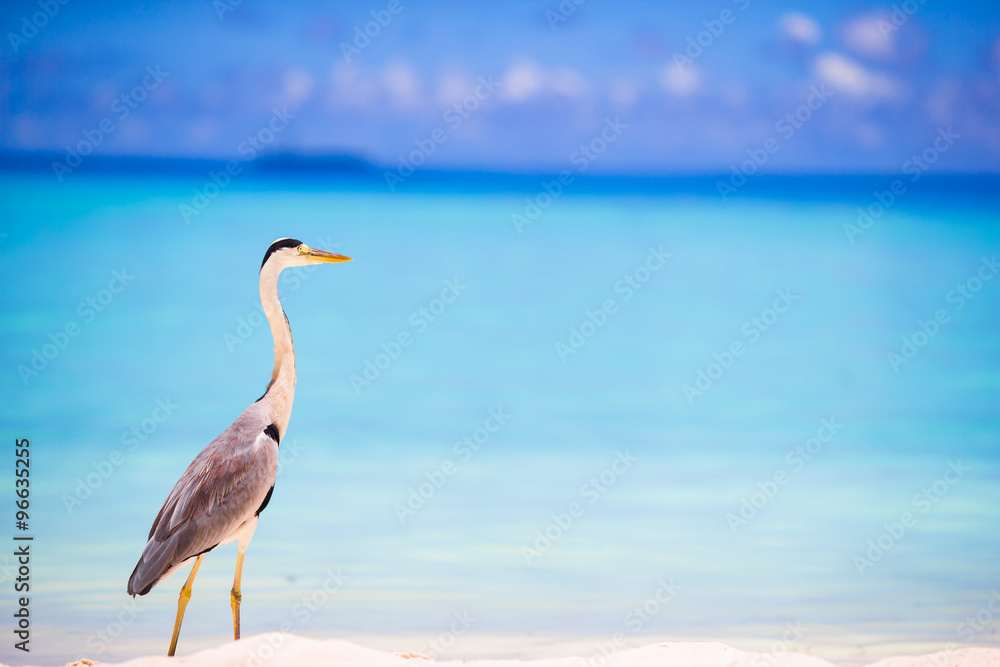 Fototapeta Grey heron standing on white beach on Maldives island
