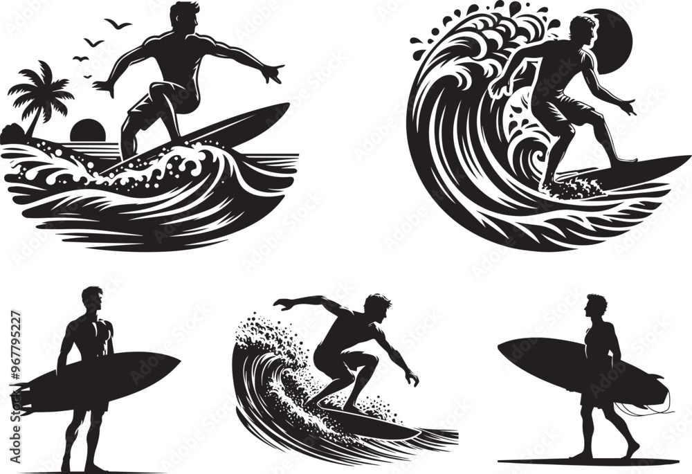 Fototapeta Surfing Man Silhouette, Surfer Riding Wave Vector , Surfboard Icon on White Back
