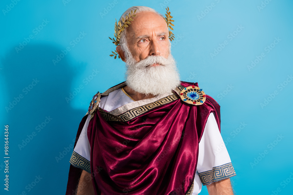 Fototapeta Photo of powerful mature man look confident empty space wear ancient roman emper