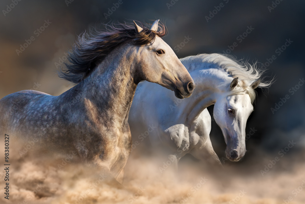 Fototapeta Pár koní běží v prachu při západu slunce světlo