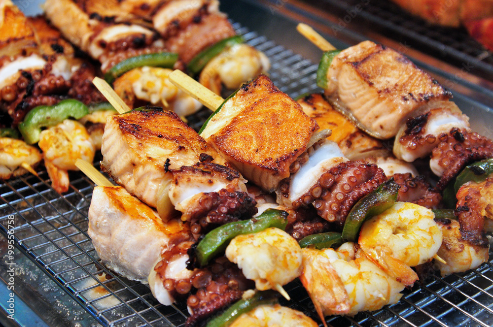 Fototapeta Grilled skewers of seafood consist of salmon, cuttlefish, scampi, and vegetables