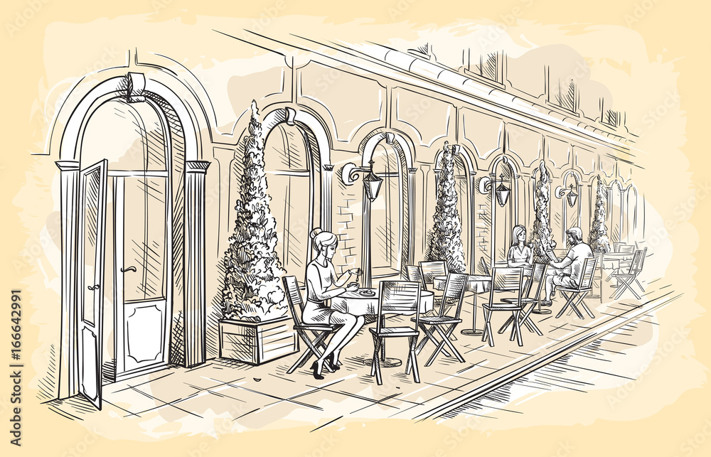 Fotografie French Street Cafe, Hand drawn Vector Illustration