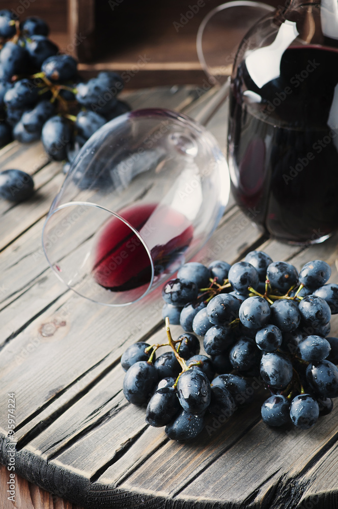 Fresh grape and red wine on the vintage table